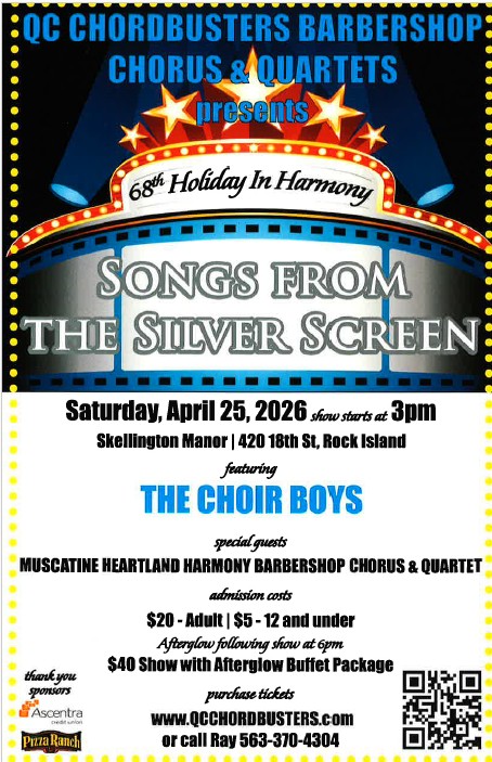 Join the QC Chordbusters for our annual show, Songs from the Silver Screen, a toe-tapping celebration of unforgettable music made famous by the movies. From timeless classics to cinematic favorites, we’ll bring the big screen to life through rich, four-part barbershop harmony.